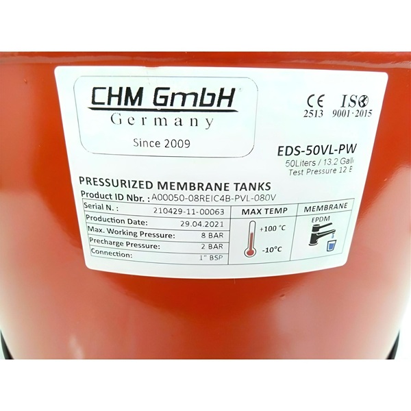 Das Modell mit 50 Liter Fassungsvermögen (EDS-50VL-PW) verfügt über einen praktischen Standfuß und kann Temperaturen von -10°C bis +100°C problemlos bewältigen. Der Betriebsdruck beträgt 8 bar, die Wandung ist 1,2 mm dick, und der Kessel wurde einem Testdruck von 12 bar angepasst.